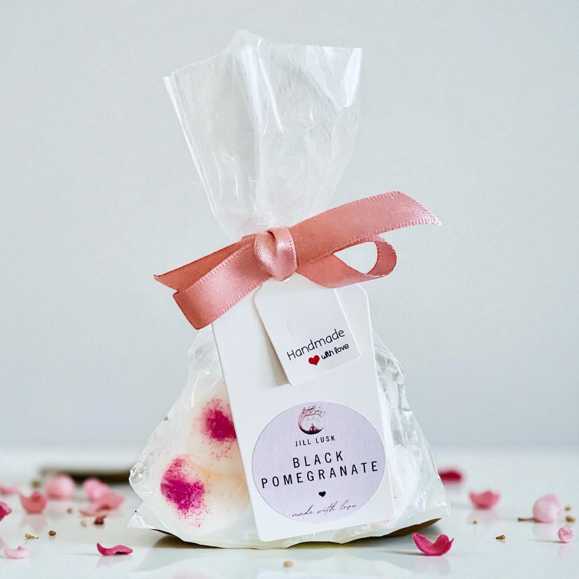 Bag of 6 wax melts packaged in a cellophane bag tied with ribbon and a gift tag. Pretty heart shaped melts sprinkled with pink glitter.